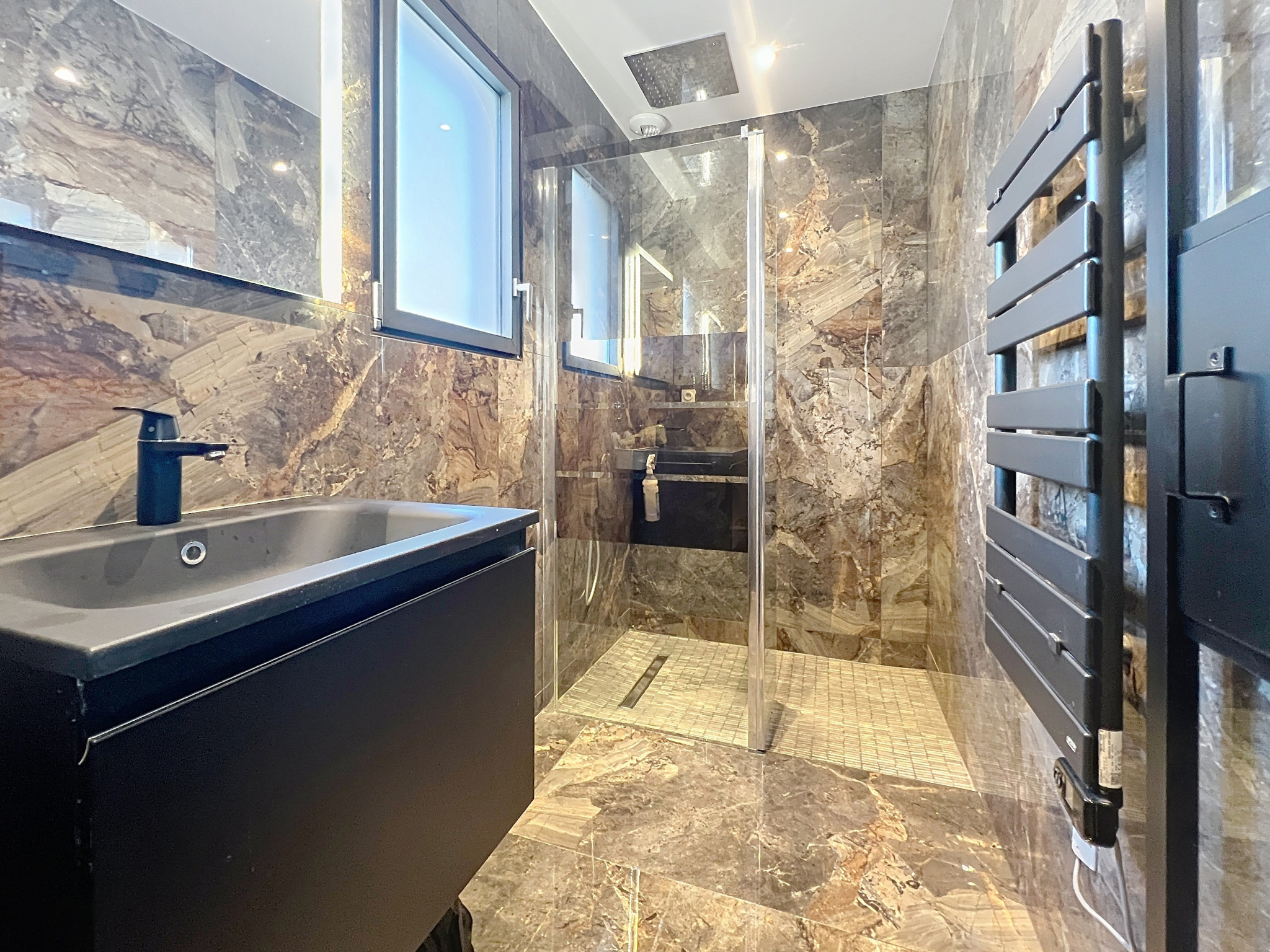 Salle d’eau attenante (douche à l’italienne avec ciel de pluie, faïence toute hauteur, vasque suspendue)