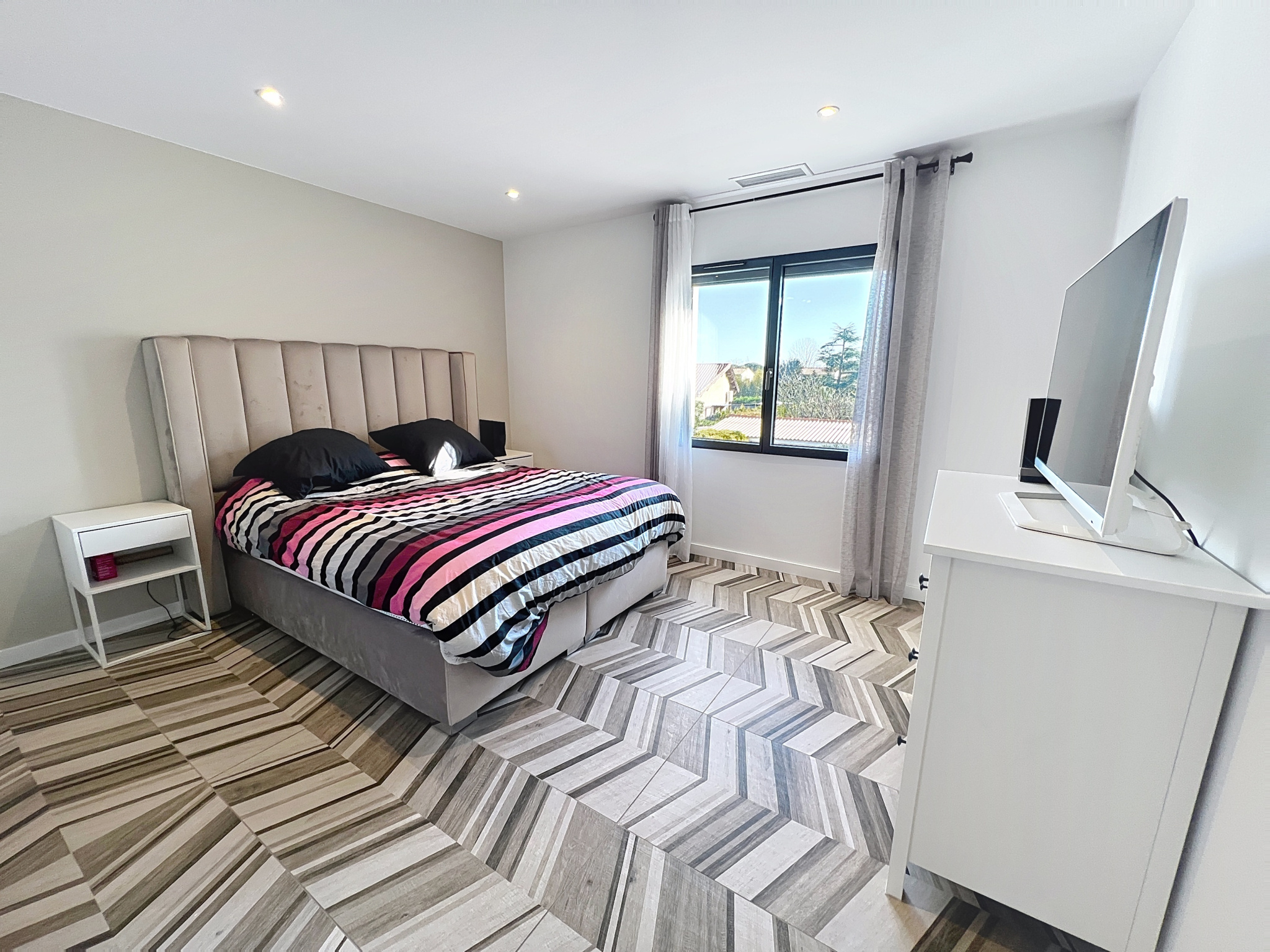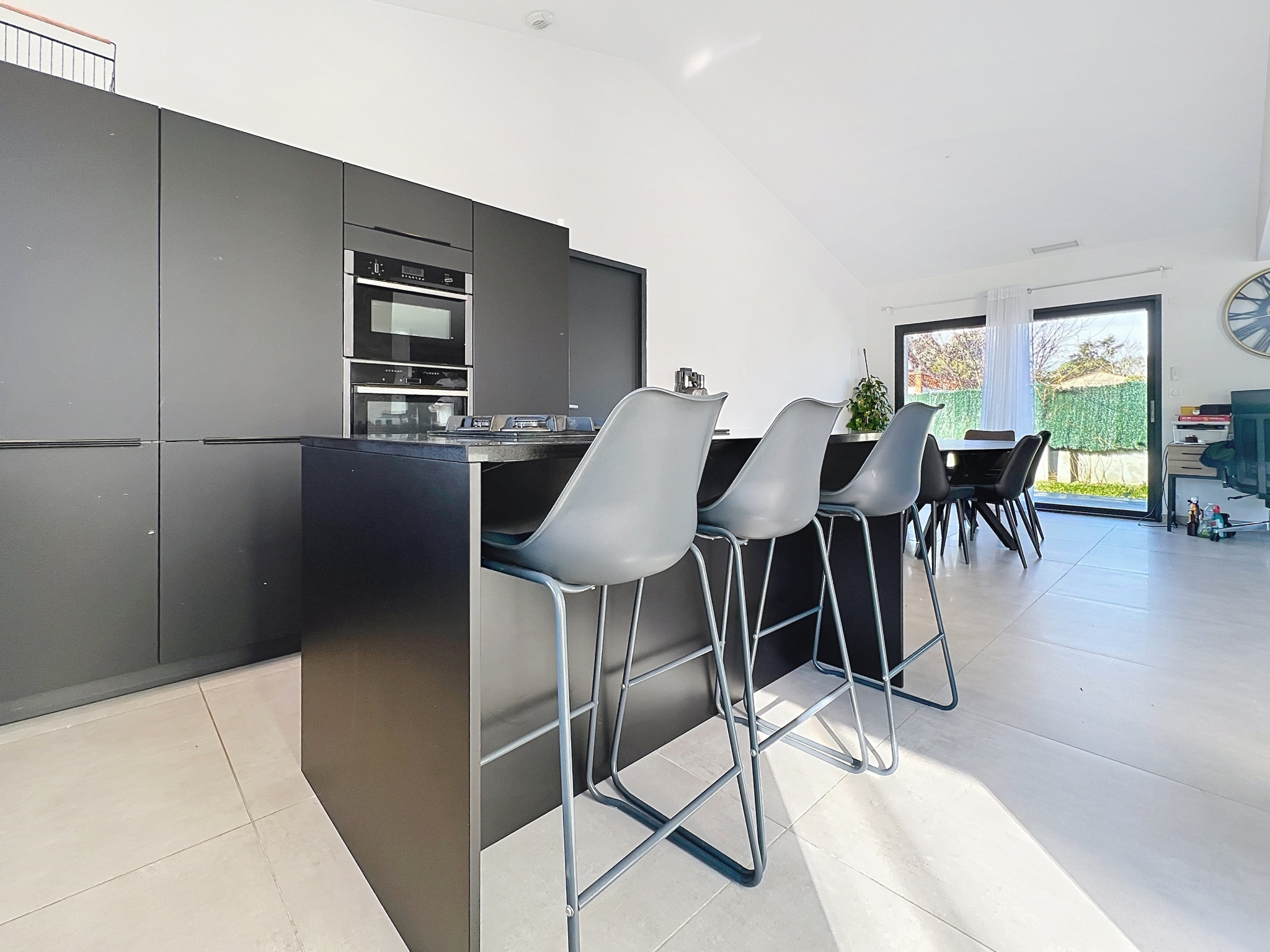 Villa contemporaine individuelle de type T5, construite en 2021 et conforme à la réglementation thermique RT 2020, développant 148m² habitables, édifiée sur une parcelle plate de 713 m² avec piscine.